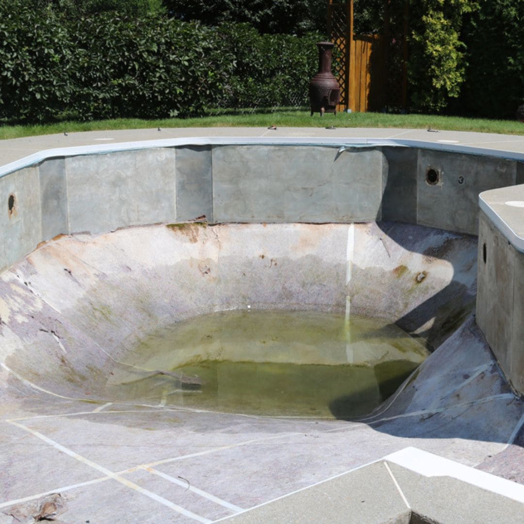 La plupart des piscines creusées ont une marche en fibre de verre blanche située du côté peu profond. Cette marche a tendance à fendre sur les côtés après des hivers rigoureux et malheureusement ces bris ne sont pas réparables et exigent aussi le changement de la toile; les budgets sont conséquents.
